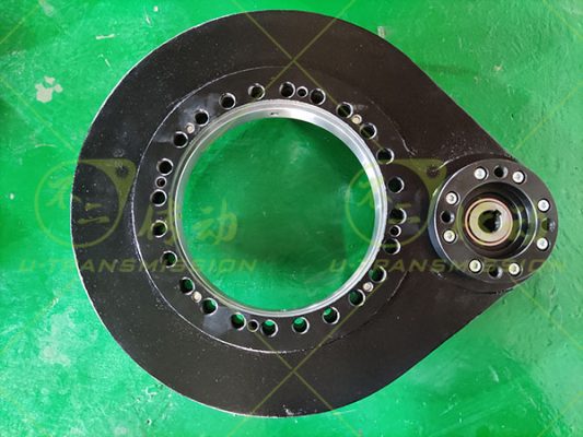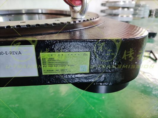 根據(jù)上述工況回轉(zhuǎn)支承按照大傾覆力矩設(shè)計(jì),采用小游隙高精度設(shè)計(jì),確保高轉(zhuǎn)速下回轉(zhuǎn)驅(qū)動(dòng)旋轉(zhuǎn)平穩(wěn),齒采用表面感應(yīng)淬火,保證大的輸出扭矩及耐磨性能,齒芯部柔軟,具有很好的耐沖擊性,適合大慣量,大沖擊載荷。殼體采用球墨鑄鐵QT450-10鑄造而成,機(jī)械性能優(yōu)良,穩(wěn)定性高,耐磨抗震,殼體表面噴塑處理,防銹美觀,噴塑前進(jìn)行磷化處理,提高防銹能力及噴塑的附著力。輸入端法蘭按照客戶馬達(dá)輸出端尺寸設(shè)計(jì)制造,客戶可以直接連接馬達(dá),給客戶提供很大的便利,減少連接部件,增加穩(wěn)定性,節(jié)約空間,縮小整機(jī)體積,降低陳本。