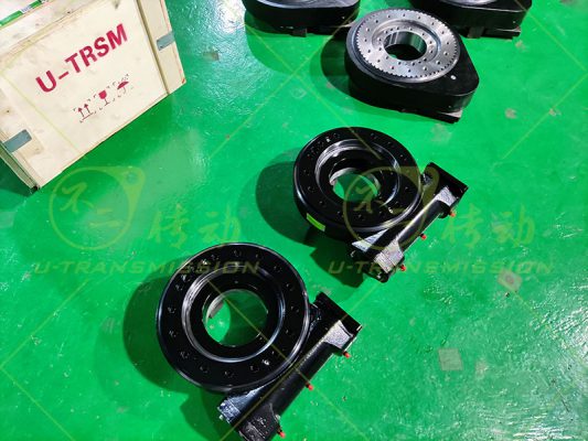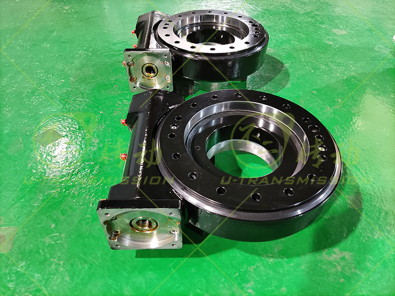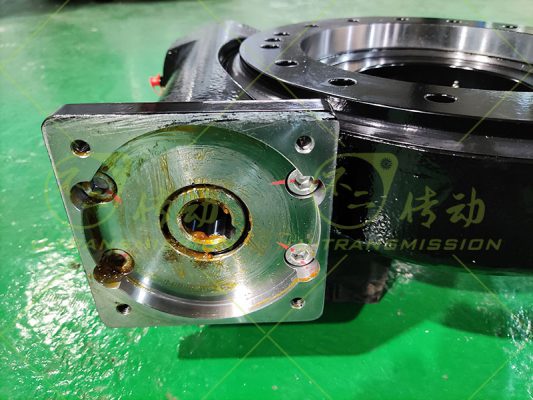 SE9 蝸輪蝸桿回轉(zhuǎn)驅(qū)動裝置應(yīng)用在自動化設(shè)備上,驅(qū)動豎直安裝,帶動工裝翻轉(zhuǎn),用戶設(shè)備轉(zhuǎn)速低,輸出扭矩大,需要大減速比,必須能夠機(jī)械自鎖,在突發(fā)狀況下,工裝需要保持不動,根據(jù)用戶的要求推薦用戶使用SE9,工程師幫用戶在標(biāo)準(zhǔn)驅(qū)動的基礎(chǔ)上改裝適配法蘭,使客戶的減速機(jī)可以跟回轉(zhuǎn)驅(qū)動裝置直接連接,減少中間環(huán)節(jié),降低成本,增加可靠性,獲得用戶好評。
