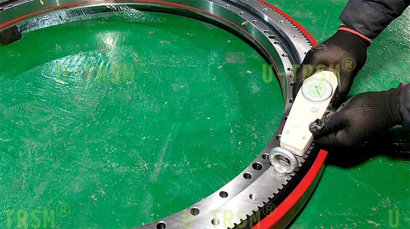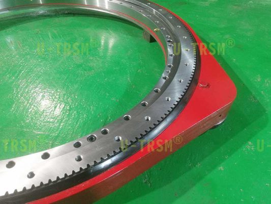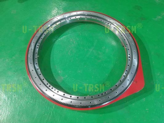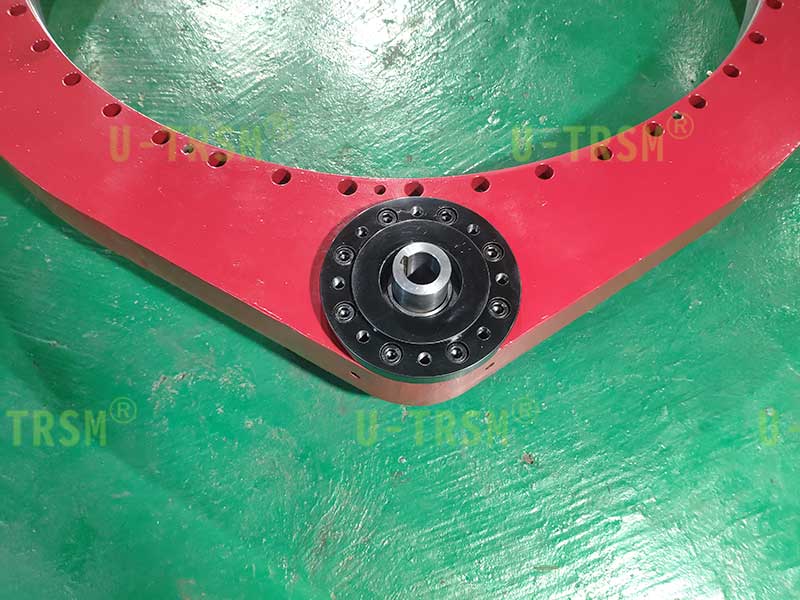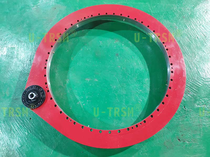 這是一款輕系列的直齒回轉(zhuǎn)驅(qū)動(dòng)產(chǎn)品,適合客戶低載荷的工況。小模數(shù),在直徑一定的情況下,模數(shù)越小齒的數(shù)量就越多,小齒輪相同,模數(shù)小,減速比就大,大減速比適合客戶的低轉(zhuǎn)速?;剞D(zhuǎn)中心直徑941mm,滿足了客戶對(duì)大尺寸工件穩(wěn)定支承旋轉(zhuǎn)的需求。