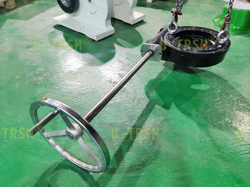 客戶的轉(zhuǎn)臺(tái)尺寸較大,離地高度比較低,如果手輪位置靠近回轉(zhuǎn)驅(qū)動(dòng),操作起來非常不方便也很不安全,所以我們?cè)O(shè)計(jì)了一根轉(zhuǎn)接軸,把手輪安裝在轉(zhuǎn)臺(tái)外面,這樣既方便操作又安全。