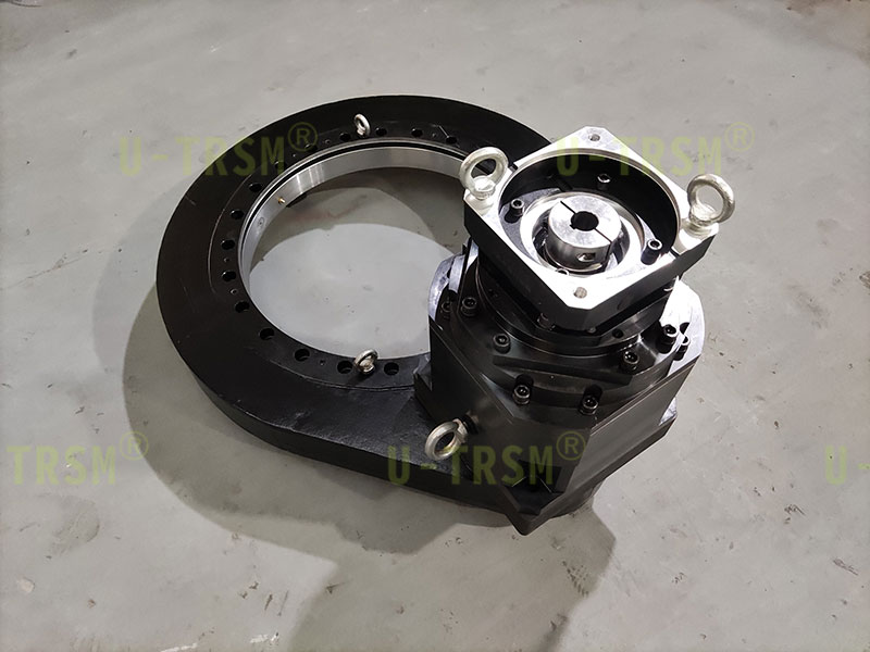 S-III-O-0655 配套三級減速機的精密磨齒回轉(zhuǎn)驅(qū)動應(yīng)用在智能制造車間的設(shè)備上,客戶使用普通電機帶動回轉(zhuǎn)驅(qū)動旋轉(zhuǎn),到達指定位置后停止,要求回轉(zhuǎn)驅(qū)動輸出轉(zhuǎn)速非常低,到達指定位置后轉(zhuǎn)臺不能有較大晃動。