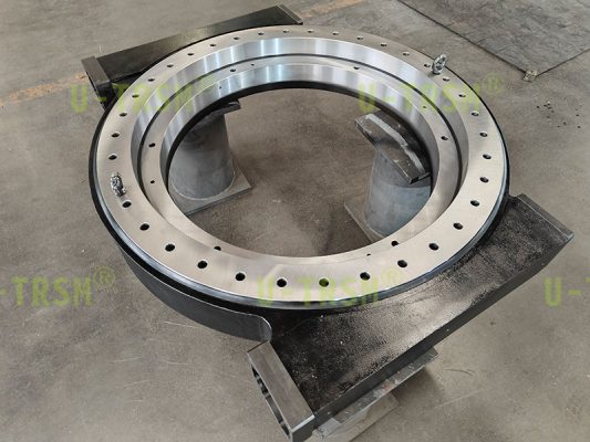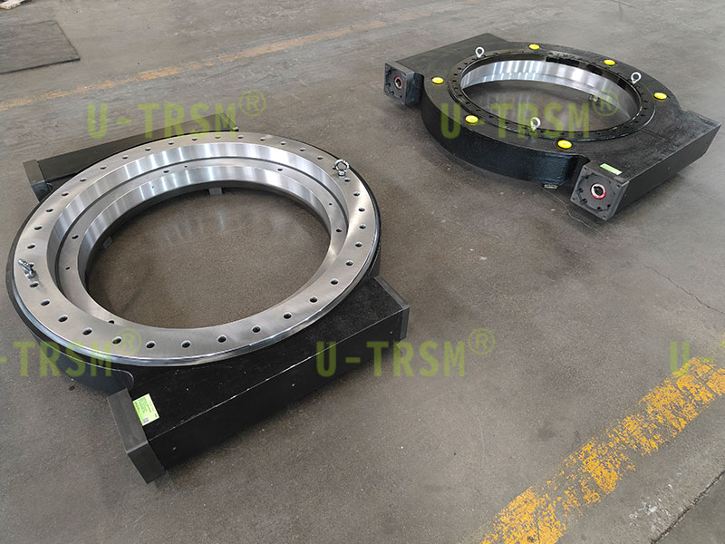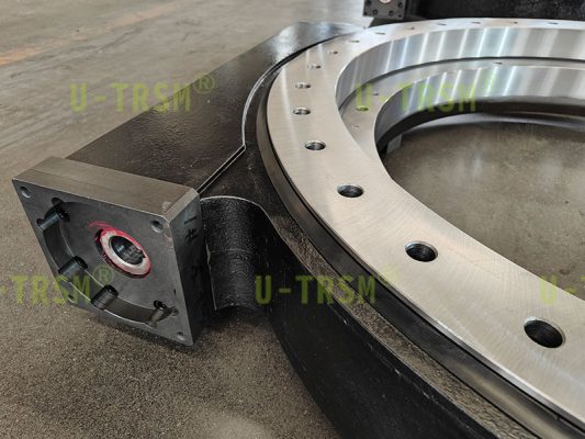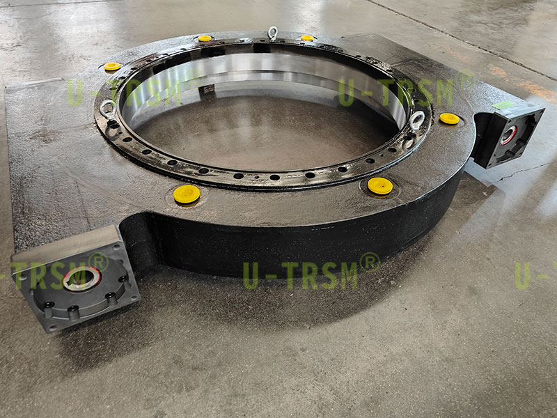 此款回轉(zhuǎn)驅(qū)動(dòng)應(yīng)用于高原低溫環(huán)境中,載荷大,扭矩大,使用環(huán)境在-40-50°C,并且要求高精度?;剞D(zhuǎn)驅(qū)動(dòng)中的回轉(zhuǎn)支承需進(jìn)行全磨加工,保證尺寸的精準(zhǔn),表面無(wú)任何劃傷,在零部件加工及搬運(yùn)過(guò)程中做保護(hù)處理。此款回轉(zhuǎn)驅(qū)動(dòng)輸出扭矩可達(dá)230kNm,保持力矩可達(dá)1400kNm,載荷可達(dá)350t,回程間隙≤0.05°,保證回轉(zhuǎn)驅(qū)動(dòng)的整體氣密性,采用加裝高質(zhì)量硅橡膠密封,不二傳動(dòng)設(shè)計(jì)工程師根據(jù)客戶的使用要求,研發(fā)了此款回轉(zhuǎn)驅(qū)動(dòng)。